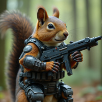 На картинке изображён антропоморфный бельчонок, стоящий на задних лапах, одетый в доспехи с металлическими деталями и шлемом. В руках он держит, похоже, современное огнестрельное оружие и направляет его вперёд. Фон – туманный лесной пейзаж с деревьями на заднем плане.