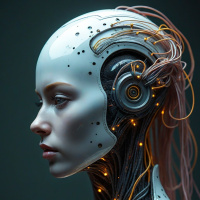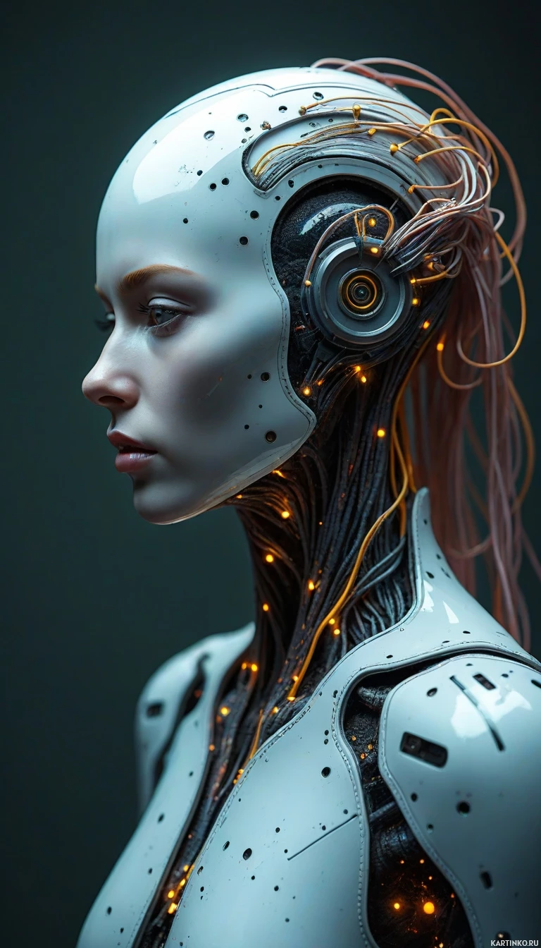На картинке стоит гуманоидный робот на темном фоне. Видны его голова и плечи. Голова заключена в блестящую серебряную оболочку с механическими элементами, намекающими на передовые технологии. На передней части головы закреплены два заметных механических глаза. Сбоку головы можно увидеть сеть светящихся цепей, а по шее тянутся провода, указывающие на сложную систему обработки информации или распределения энергии. Плечи и верхняя часть торса робота выполнены из металлической конструкции с панелями и пластинами, что свидетельствует о прочной конструкции.
