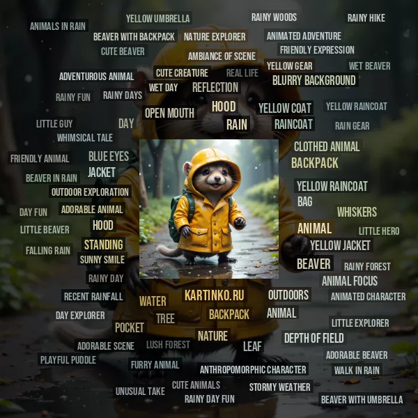 На картинке изображен антропоморфный бобр. У него доброе выражение лица, глаза закрыты, будто он наслаждается дождем. На нем яркий желтый дождевик, который плотно прилегает к телу, а капюшон поднят, чтобы защитить от дождя. На шее у него зеленый рюкзак, закрепленный лямками, что говорит о том, что он, возможно, отправился в приключение или путешествие. Земля мокрая, что указывает на прошедший дождь, а на заднем плане видны деревья и подлесок, создающие пышную лесную обстановку.