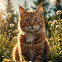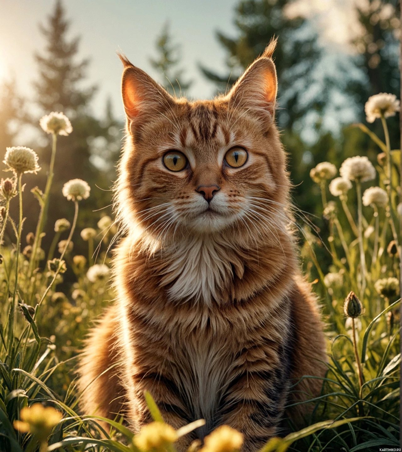 Рыжий кот с желтыми глазами сидит на траве, окруженный цветами. Солнце светит, и вокруг раскинулся густой зеленый лес.
