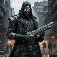 The image features a character wearing a black hood and mask with red glowing eyes, suggesting an ominous presence or supernatural elements. This character is holding a weapon that appears to be a firearm with multiple barrels. The setting looks like a dimly lit urban alleyway, possibly inspired by steampunk or cyberpunk themes, indicated by the industrial design of the structures and the presence of other figures in the background, also dressed in similar attire with masked faces.