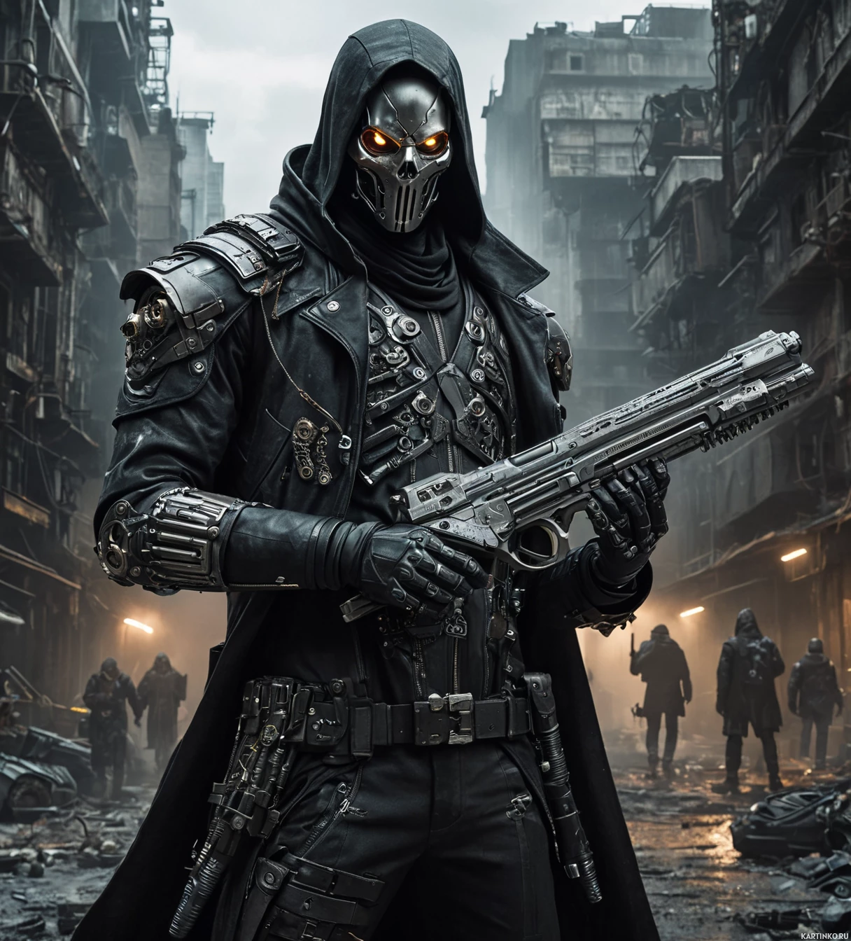 На картинке изображён персонаж в чёрном капюшоне и маске с горящими красными глазами, что создаёт ощущение зловещей угрозы или присутствия сверхъестественного. В руках у него оружие, похожее на многоствольный пистолет. Действие происходит в тускло освещённом городском переулке, возможно, вдохновлённом стилями стимпанк или киберпанк, что подчёркивается индустриальным дизайном зданий и наличием других фигур на заднем плане, одетых в подобную одежду и скрывающих лица масками.