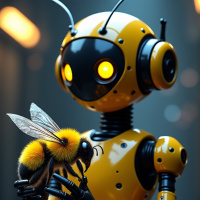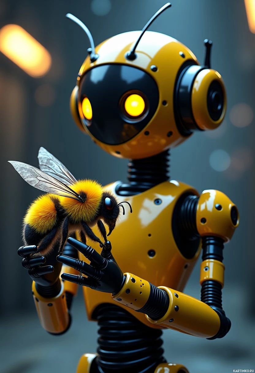 red eyes. The robot has two arms, one of which is holding a bee. The bee appears to be nestled against the robot's hand. Both the robot and the bee are illuminated by light, indicating that they might be in