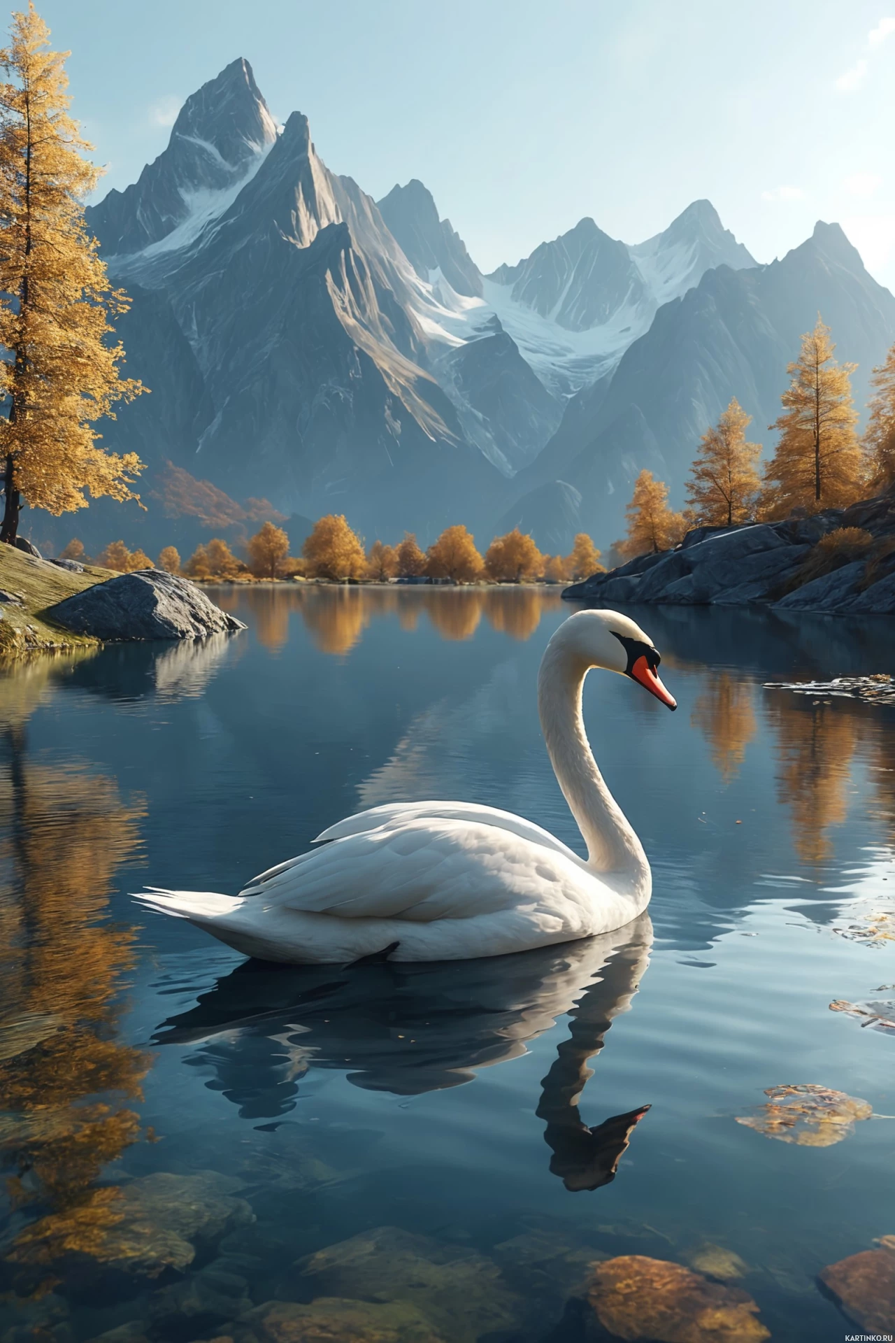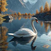 a large swan resting on the water's surface, reflecting its surroundings. On the land around the lake, there are trees that appear to be turning yellow and orange, indicating they might be changing seasons or simply in a region where such colors are part of their