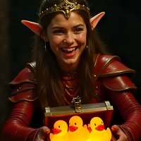 In the image, a young woman is depicted with an elven appearance. She has pointed ears and wears a crown on her head adorned with what appears to be golden jewels or flowers. Her eyes are downcast, looking away from the camera, which gives a contemplative expression. The background is dark, creating a contrast that highlights her character. She is dressed in a vibrant red outfit with gold accents, suggesting a royal or heroic status. On her left hand, there's a bracelet that seems to be of the same material as her crown, perhaps signifying importance or nobility within her context. In her right hand, she holds a small wooden chest filled with rubber ducks. The juxtaposition of the serious and fantastical elements with the playful presence of the rubber ducks creates a whimsical atmosphere in the image.