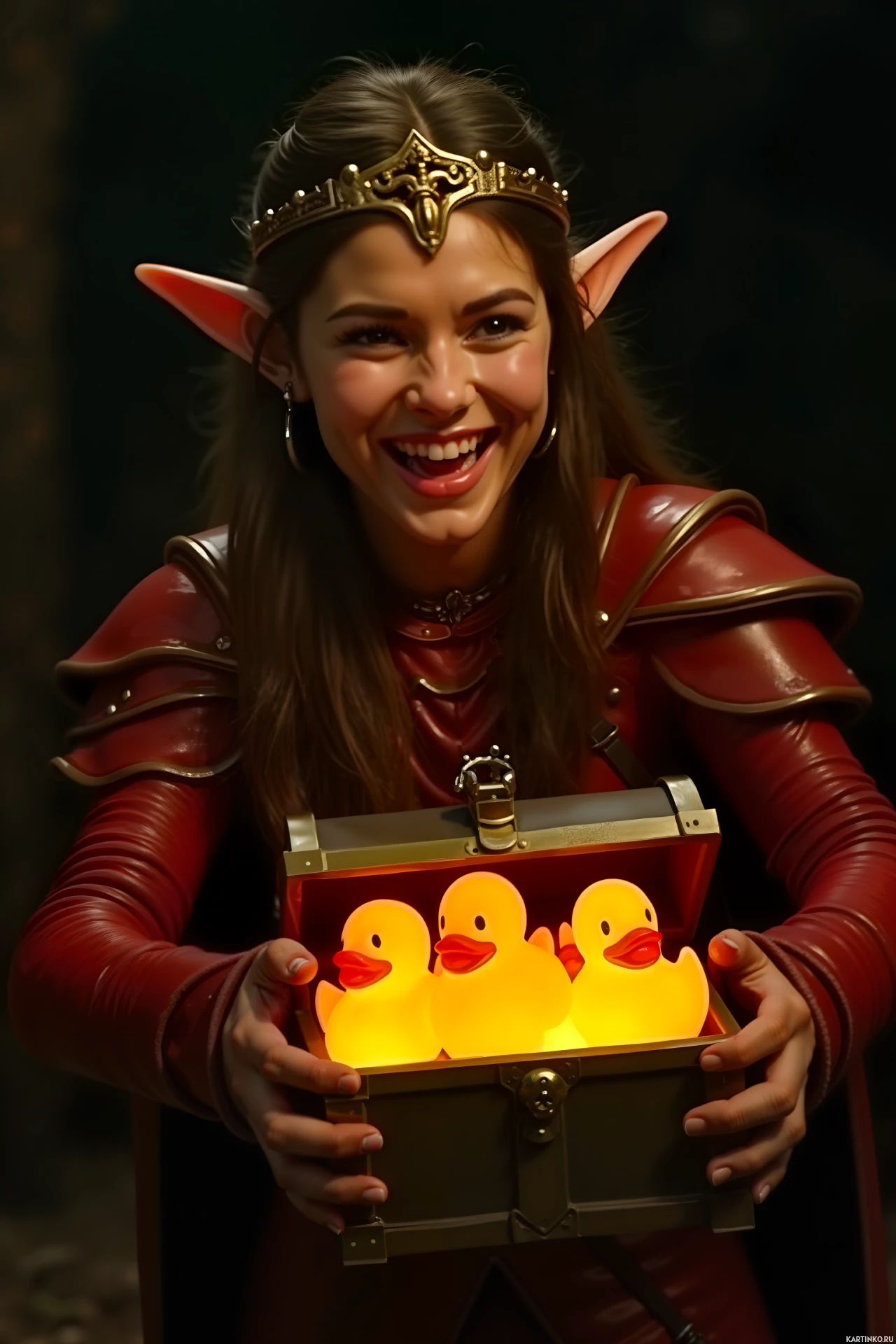 На картинке изображена молодая женщина с эльфийской внешностью. У неё заострённые уши и на голове корона, украшенная, кажется, золотыми драгоценностями или цветами. Её взгляд опущен, она смотрит в сторону от камеры, что придаёт ей задумчивое выражение. Фон тёмный, создавая контраст, который подчёркивает её характер. Она одета в яркий красный наряд с золотыми акцентами, что указывает на её королевский или героический статус. На левой руке браслет, выполненный, похоже, из того же материала, что и её корона, возможно, символизирующий её значимость или благородство. В правой руке она держит небольшой деревянный ларец, наполненный резиновыми уточками. Сочетание серьёзных и фантастических элементов с игривым присутствием резиновых уточек создаёт причудливую атмосферу на картинке.