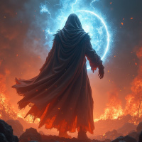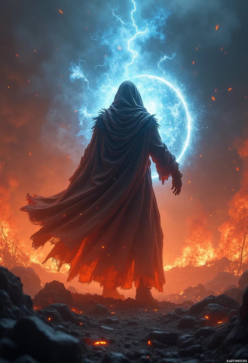 На картинке стоит фигура на фоне пылающего пейзажа. Фигура скрыта под капюшоном и закутана в плащ, что скрывает лицо и добавляет таинственности. За её спиной два разряда молнии обрушиваются с неба, создавая резкий контраст с огнём внизу. Скалы, на которых стоит фигура, испещрены трещинами и разломами, намекая на сильный жар и нестабильную обстановку. Несмотря на царящий вокруг хаос, фигура источает спокойствие и уверенность, невозмутимо стоящая в этом адском пейзаже.