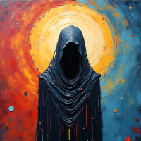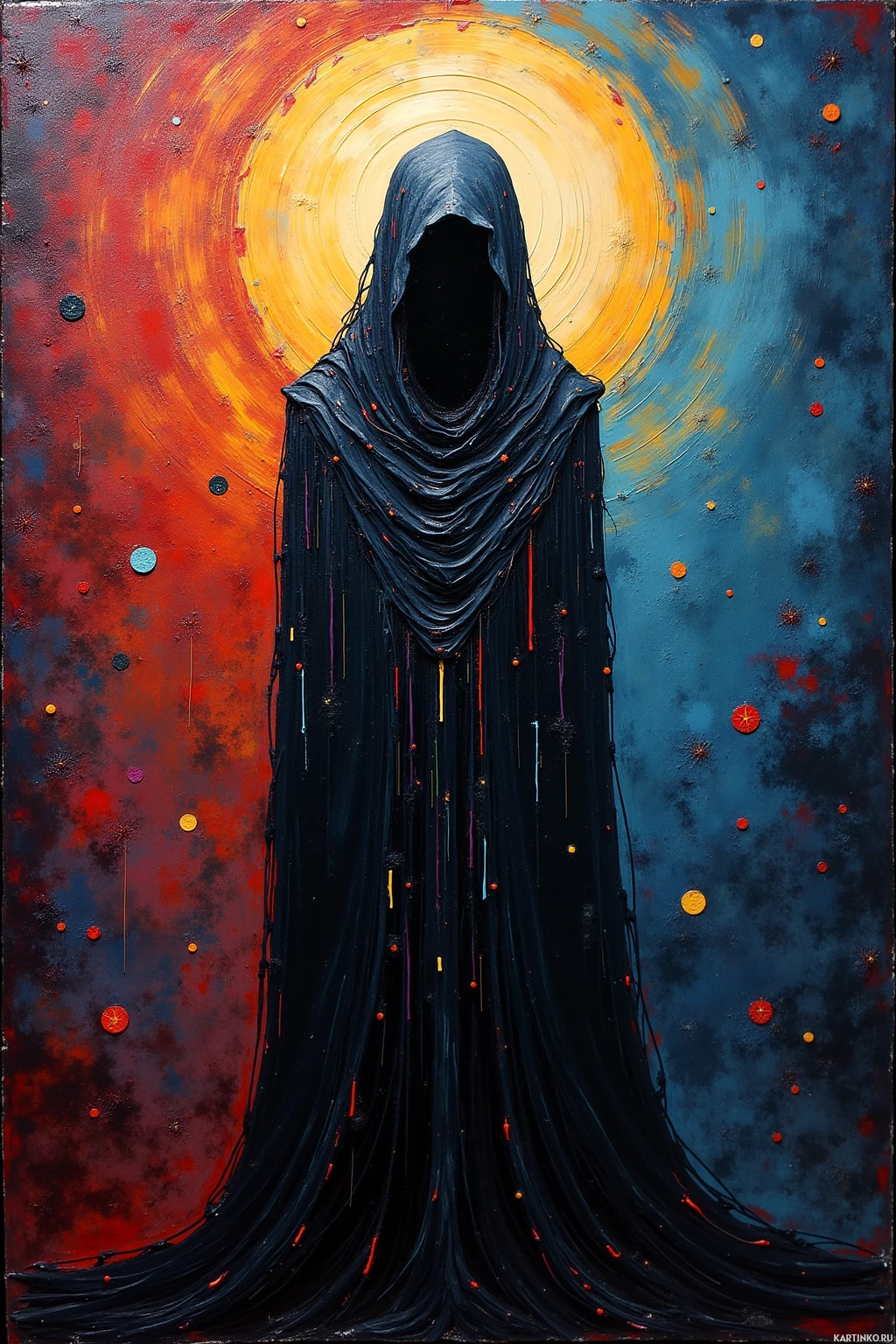 На картинке изображено стилизованное художественное представление фигуры, облачённой в одеяние, возможно, в капюшон, на фоне космического пространства. Фигура расположена в центре и стоит прямо. Фон насыщенно детализирован витиеватыми узорами в красных, синих и жёлтых тонах, напоминающими небесные тела или галактику. В целом, стиль предполагает, что это может быть картина или цифровое произведение искусства, призванное вызвать ощущение потусторонности или мистики.
