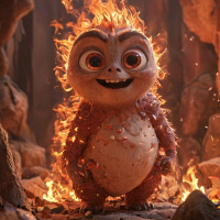 The image depicts an animated creature with a flame for hair and skin that appears to be burnt or scorched, suggesting it has been involved in a fire. It stands within what looks like a stone archway, surrounded by fiery debris, indicating the aftermath of a destructive event involving fire. The creature's expression is one of surprise or confusion, as its eyes are wide open and mouth slightly agape, showing teeth that look sharp and pointed.