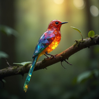 На картинке красуется яркая птица с радужным оперением, сидящая на ветке в лесу. Её крылья распахнуты, что придаёт ей живой и энергичный вид. Фон состоит из различных оттенков зелёного, создавая впечатление густого, лесного пейзажа.