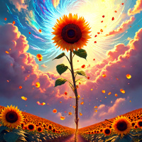 The image features a vibrant sunflower in the center, reaching towards the sky. Surrounding the sunflower are numerous small sunflowers. Above this central arrangement is a cosmic scene with swirling patterns that could be interpreted as planets or nebulae. Below the sunflower, there's an expansive field, and the horizon line shows a pathway that leads to a bright light source, possibly the sun. The sky is filled with dynamic clouds and stars shining in the background. The overall style of the artwork leans towards fantastical or surreal, often associated with digital illustrations that blend natural elements with otherworldly themes.
