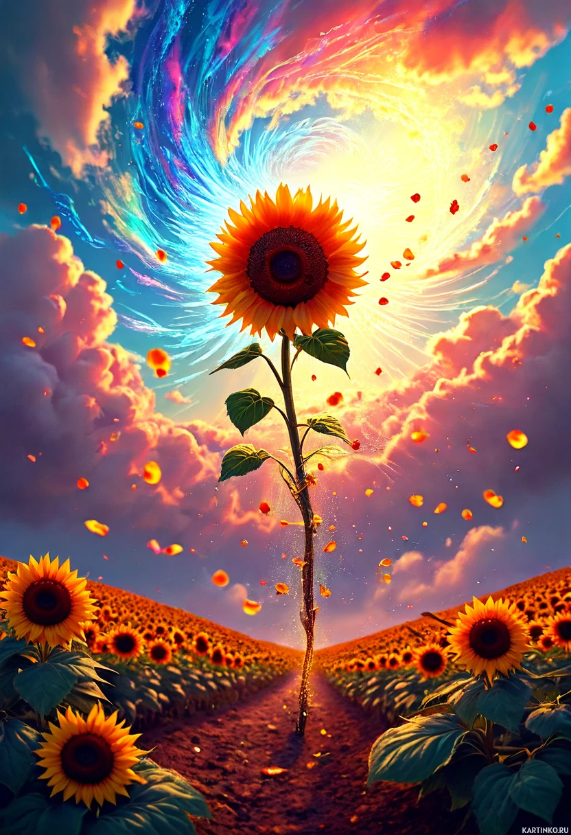 На картинке – яркий подсолнух в центре, тянущийся к небу. Вокруг него множество маленьких подсолнухов. Над этой центральной композицией – космическая сцена с вихревыми узорами, напоминающими планеты или туманности. Внизу, под подсолнухом, простирается бескрайнее поле, а на линии горизонта виднеется тропинка, ведущая к яркому источнику света, возможно, к солнцу. Небо заполнено динамичными облаками, а на заднем плане сияют звёзды. В целом, стиль картинки тяготеет к фантастическому или сюрреалистическому, характерному для цифровых иллюстраций, объединяющих природные элементы с неземными мотивами.