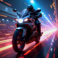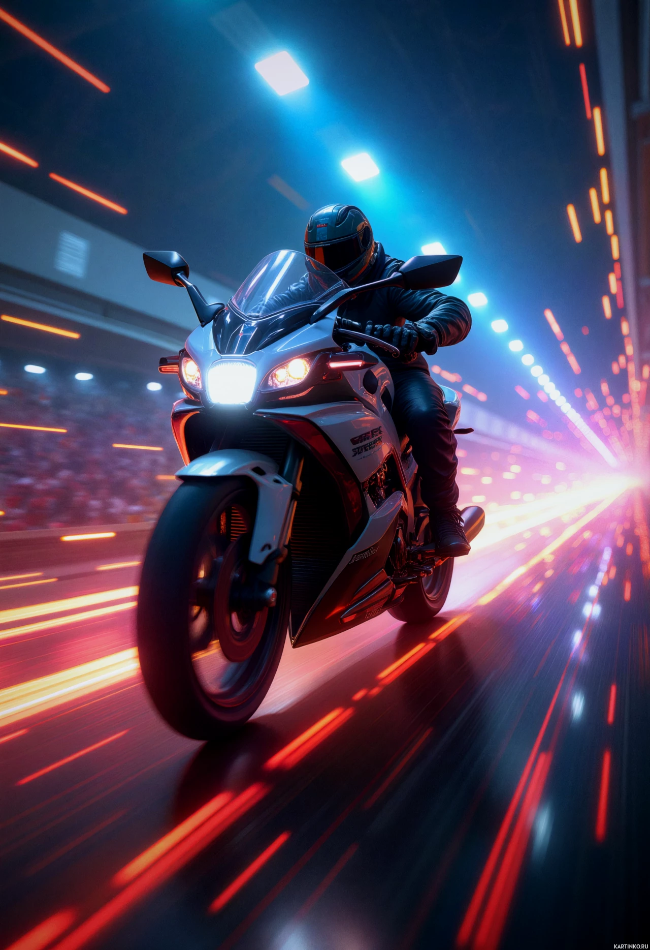 На картинке запечатлен человек, едущий на мотоцикле по, судя по всему, крытому треку – об этом говорят искусственное освещение и стены, окружающие пространство. У водителя защитная экипировка, включая полнолицевый шлем, черного цвета, а дизайн мотоцикла намекает на то, что это гоночный байк с заметной фирменной символикой. Цвета в сцене в основном темные, с синими акцентами, которые подчеркивают отдельные участки, создавая атмосферу, усиливающую ощущение скорости и движения. Свет фокусируется на водителе и мотоцикле, а размытый фон говорит о движении в пространстве.