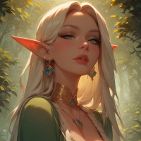 The image features a stylized portrait of an elf character with white hair and pointed ears, set against a forest backdrop that includes tall trees and autumnal foliage. The character is dressed in fantasy attire, consisting of a high-collared top with golden accents, which could be interpreted as armor, paired with jewelry such as earrings and a necklace. Her expression is neutral with her gaze directed slightly off to the side, and she has subtle makeup highlighting her eyes and lips. The overall style of the image is illustrative, suggesting it could be from a fantasy game or artwork.