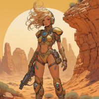 На картинке изображена девушка с светлыми волосами в футуристической броне, включающей золотистые металлические элементы и, похоже, оружие. Она стоит на пустынном ландшафте с каменными образованиями на фоне под ясным небом.