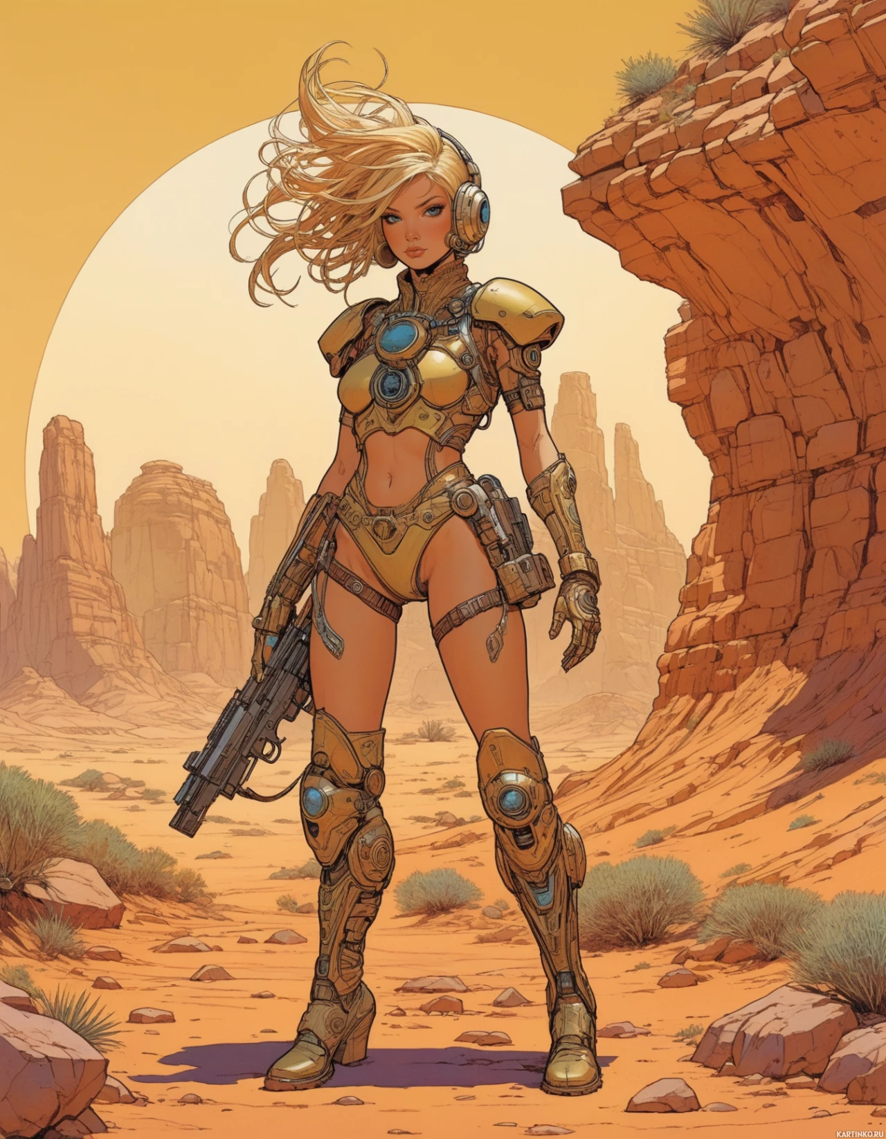 The image features a female character with blonde hair, dressed in futuristic armor that includes gold-colored metal pieces and what appears to be a gun. She is standing on a desert landscape with rock formations in the background under a clear sky.