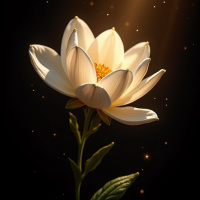 In the image, a lotus flower is prominently featured. The flower has petals in shades of pink and white, creating a soft, delicate appearance. At the heart of the lotus flower, there is a yellow center that suggests the presence of seeds or a bud. The stem from which the flower grows is long and thin, extending downwards into the dark background. Surrounding the flower are small golden particles or sparks, giving off an ethereal glow. The backdrop of the image is black, which contrasts with the colors of the lotus flower, making it stand out as the focal point of the image.
