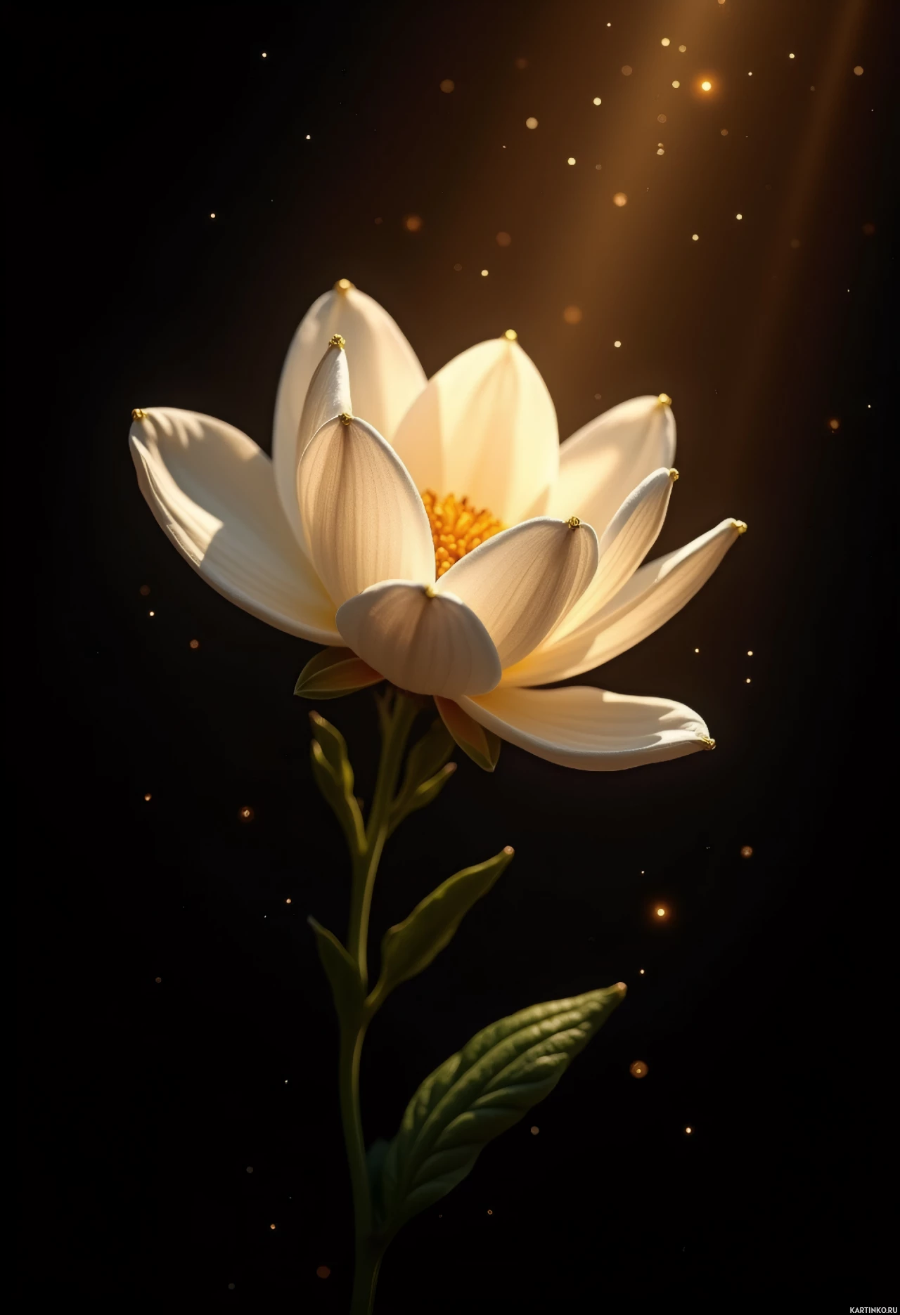 На картинке выделяется лотос. Лепестки цветка нежно-розовые и белые, создавая мягкое, изящное впечатление. В центре лотоса – желтая сердцевина, намекающая на семена или бутон. Длинный и тонкий стебель тянется вниз, на фоне темного фона. Вокруг цветка – мелкие золотистые частички, словно искры, дающие ему неземное свечение. Фон картинки черный, что контрастирует с цветами лотоса и делает его главным акцентом.