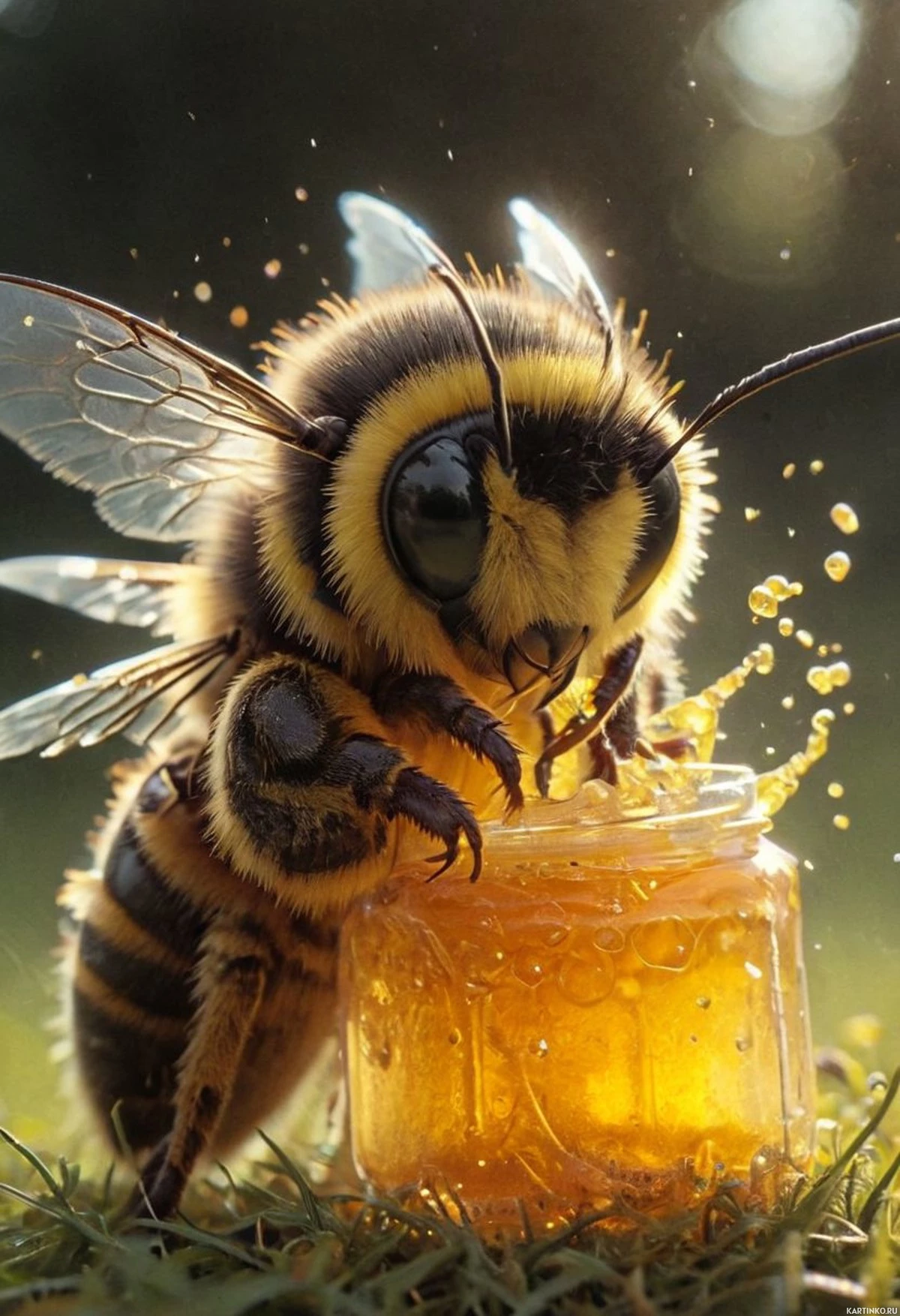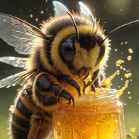droplets of liquid around the bee, possibly representing honey being dropped from its legs into the jar below. This artwork does not accurately represent a real-