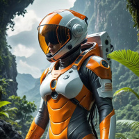 a tropical environment such as a rainforest. This contrasts with the modern, technological appearance of the armor, creating a juxtaposition between nature and technology. The overall impression is one of