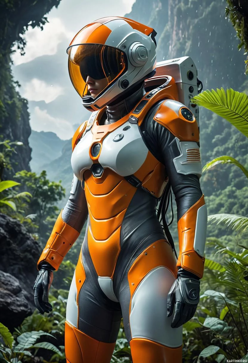 На картинке изображен персонаж в футуристических доспехах оранжево-белой цветовой гаммы. В доспехах присутствует шлем, и они выглядят детализированными, что указывает на продвинутые технологии или элементы научной фантастики. Персонаж стоит на фоне, похожего на естественную местность, возможно, лес или джунгли, что подкрепляется окружающей зеленью.