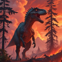 На картинке изображена сцена, где на переднем плане выделяется огромный динозавр. У него мускулистое телосложение, и он идёт прямо на зрителя. Его кожа чешуйчатая, с характерными шипами вдоль шеи и хвоста, свойственными этому виду. На заднем плане – драматичный пейзаж, освещенный тёплыми лучами, словно на рассвете или закате. Вокруг разбросаны сосны, а вдалеке видны горы, скрытые под багряными облаками. Река извивается через всю сцену, петляя слева направо. Цвета в работе яркие, много красного и оранжевого, что создаёт напряжённую атмосферу. Стиль – реалистичный, с высокой степенью детализации, особенно заметной в текстуре кожи динозавра и элементах пейзажа.