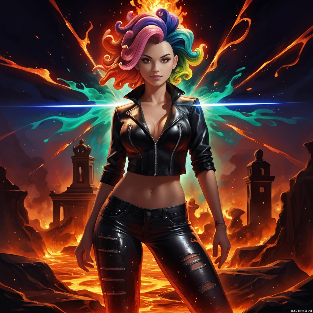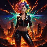 an animated female with distinctive features. She has rainbow-colored hair, styled in a bob cut, and is wearing a black