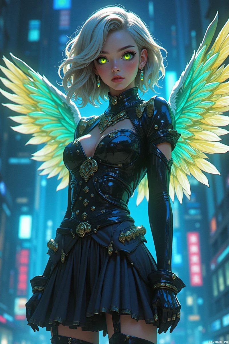 На картинке изображена девушка с короткой белой шевелюрой и огромными зелёными крыльями. На ней чёрный кожаный костюм с золотыми деталями, а на лице – суровое выражение. Фон указывает на городской пейзаж, залитый неоновым светом, с ночными вывесками и огнями.