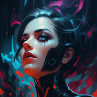 The image depicts a character with striking features. She has short dark hair and her skin is fair. Her face is adorned with intricate tattoos or markings that give her an otherworldly appearance. She wears a black and orange suit that appears to be futuristic in design, featuring what looks like mechanical elements or augmentations on the chest and neck areas. The background consists of abstract shapes and vibrant colors—red, blue, and green—that blend into one another, creating an intense visual effect.