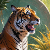 На картинке запечатлён тигр в естественной среде обитания. У него яркая оранжево-чёрная шкура с характерными отметинами на морде и теле. Тигр изображён стоя, с открытой пастью, словно рыча или зевая. На заднем плане — зелень и, кажется, солнечные лучи, пробивающиеся сквозь деревья, создающие умиротворяющую атмосферу. Фон выполнен в тёплых тонах, что подчёркивает лесную обстановку.