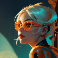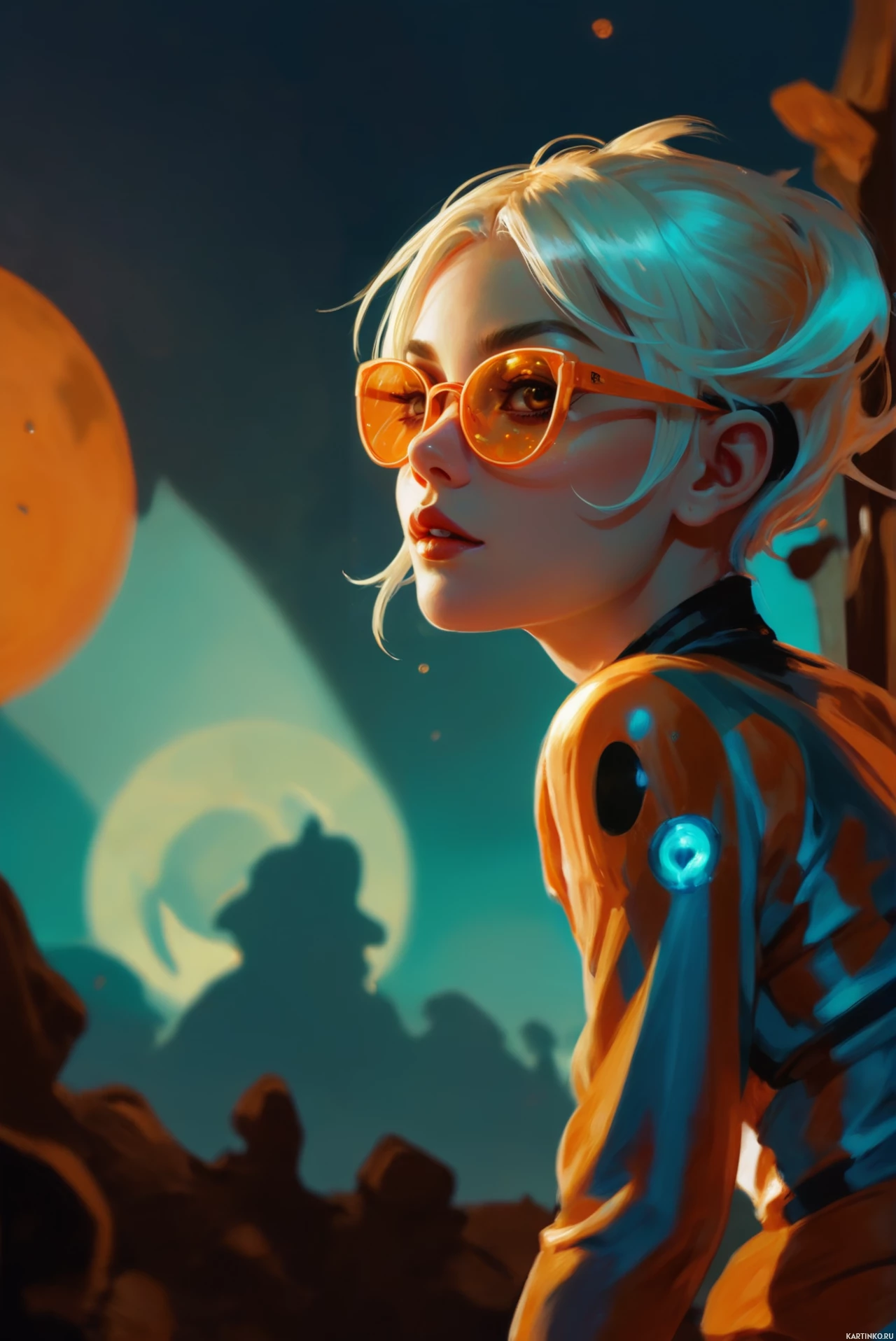 На картинке изображена женщина с белыми волосами и очками. На ней оранжевый скафандр, выполненный в стиле, характерном для экипировки космонавтов, возможно, из научно-фантастического произведения. Поза женщины намекает на то, что она может быть героиней такой истории.