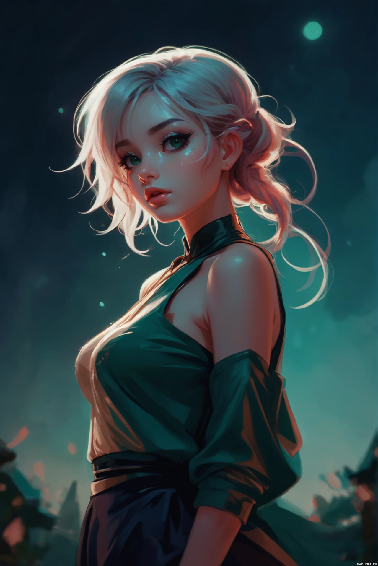 На картинке изображена девушка с короткой стрижкой боб и розовыми прядями у висков. У нее голубые глаза, а на лице макияж с румянами нежно-розового оттенка. Выражение лица нейтральное, она смотрит прямо на зрителя. Она одета в темно-зеленый корсет с золотыми деталями и высоким воротником. Ткань выглядит фактурной, возможно, напоминает кожу или металлический материал. Под корсетом – черные леггинсы. На плече у нее сумка, а на ногах – черные сапоги. На заднем плане виден силуэт, похожего на темный замок или сказочный пейзаж с башнями и развевающимися на ветру флагами. Общая атмосфера картинки мистическая и сказочная, что наводит на мысль, что она может изображать персонажа из книги или игры, действие которой происходит в таком мире.