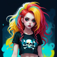 The image features a digital artwork of a female character with vibrant hair in hues of red, blue, and yellow. She has a neutral expression on her face. Her attire includes a black tank top with a skull design on it and a pair of black shorts with a distinctive zipper detailing at the side. Surrounding her is an abstract splash of colorful paint or spray, creating a dynamic backdrop that enhances the overall visual impact of the image. The character's pose suggests confidence, and she stands out against the vivid background.