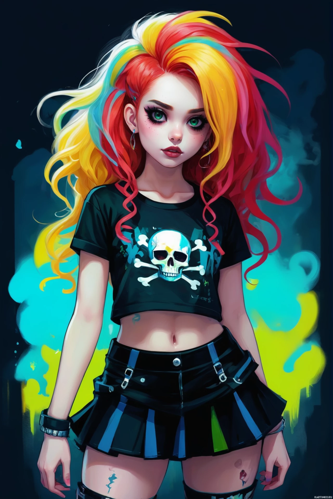 На картинке – цифровая иллюстрация девушки с яркими волосами, сочетающими красный, синий и жёлтый цвета. На её лице – нейтральное выражение. Она одета в чёрную майку с изображением черепа и чёрные шорты с оригинальной деталью в виде молнии. Вокруг неё – абстрактное пятно разноцветной краски или спрея, создающее динамичный фон, который усиливает общее визуальное впечатление. Поза девушки говорит о уверенности, и она выделяется на фоне этого яркого задника.