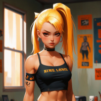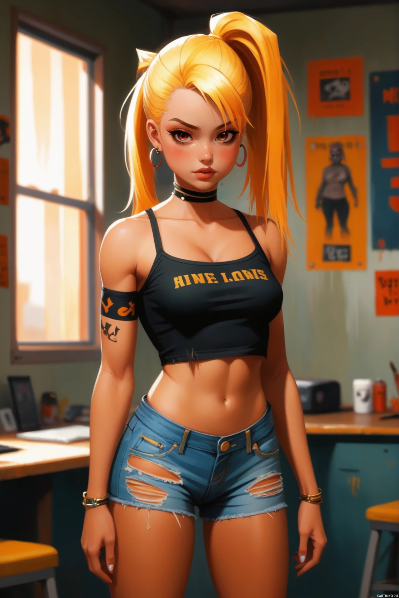 The image depicts a young woman standing in what appears to be an office environment. She has long, straight orange hair and wears makeup that gives her an intense look. Her attire consists of a black leather crop top paired with denim shorts that are ripped at the knees. She has one hand resting on a desk, suggesting she is leaning against it slightly. The setting includes a window that lets in natural light and other office elements such as a chair and what seems to be a whiteboard or chalkboard on the wall with some writing on it.