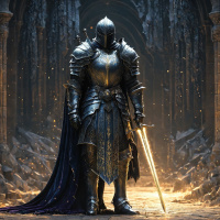 The image shows a character from a video game or a fantasy-themed work. This individual appears to be a warrior, as indicated by the sword they are holding. They are wearing armor and carrying another weapon, suggesting they might have multiple roles within their narrative context. The setting is dark and moody, with stone architecture that resembles a dungeon or underground structure, which is fitting for a character who might be on a quest or adventure. There's a blurred background that could imply a magical or mystical environment. The lighting and composition focus attention on the central figure.