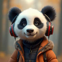In the image, a panda stands in a serene forest setting. The panda is donned in human clothing, including an orange jacket and a black backpack. It's wearing headphones on its ears, giving it a modern, youthful appearance. The background of the image features autumn trees, their leaves turning to shades of red and gold. The overall scene conveys a whimsical blend of nature and technology.