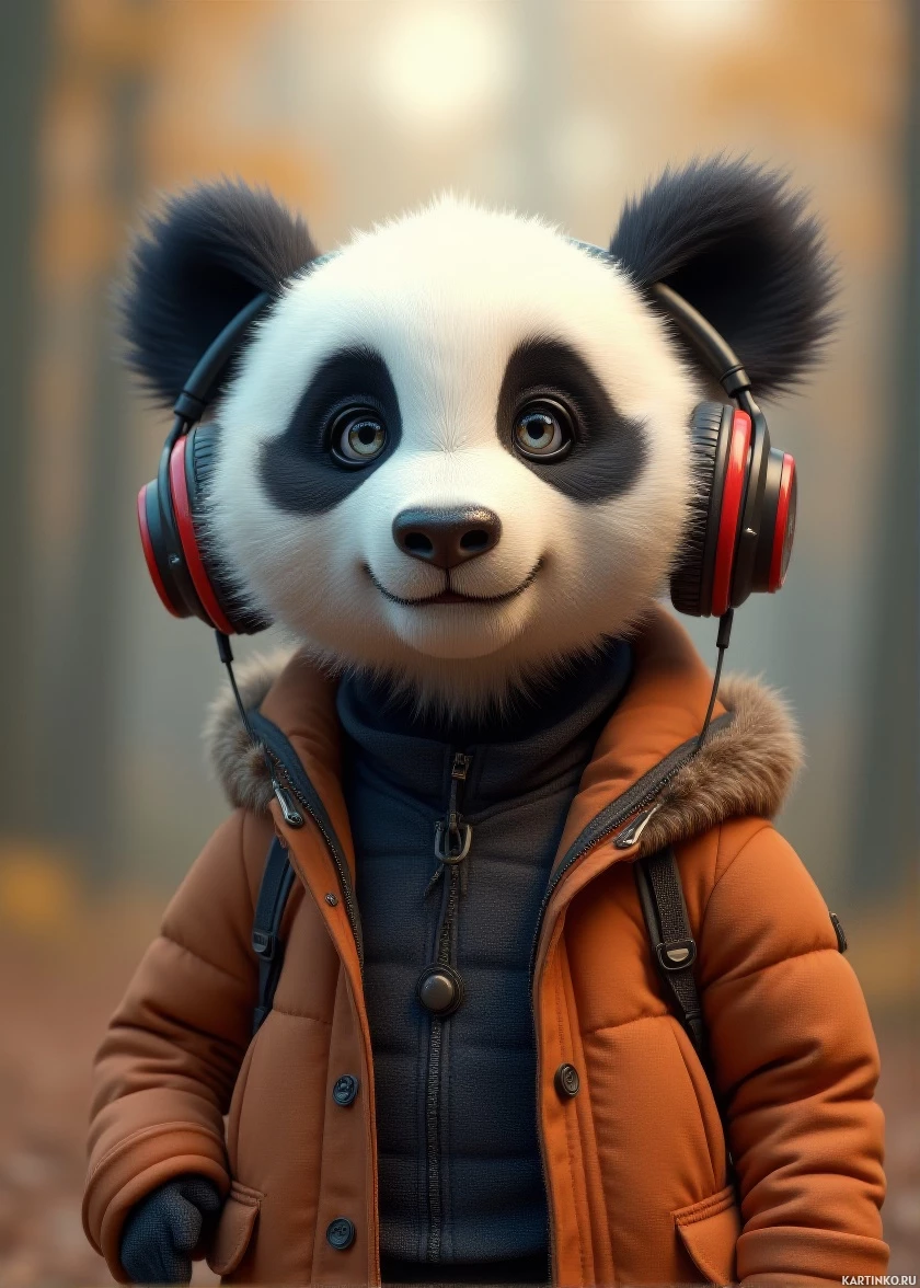 На картинке панда стоит на фоне спокойного лесного пейзажа. На ней наряжена как человек: оранжевая куртка, чёрный рюкзак. На ушах – наушники, что придает ей современный, молодежный вид. На заднем плане – осенние деревья, листва которых окрашена в оттенки красного и золотого. В целом, сцена передает необычное сочетание природы и технологий.
