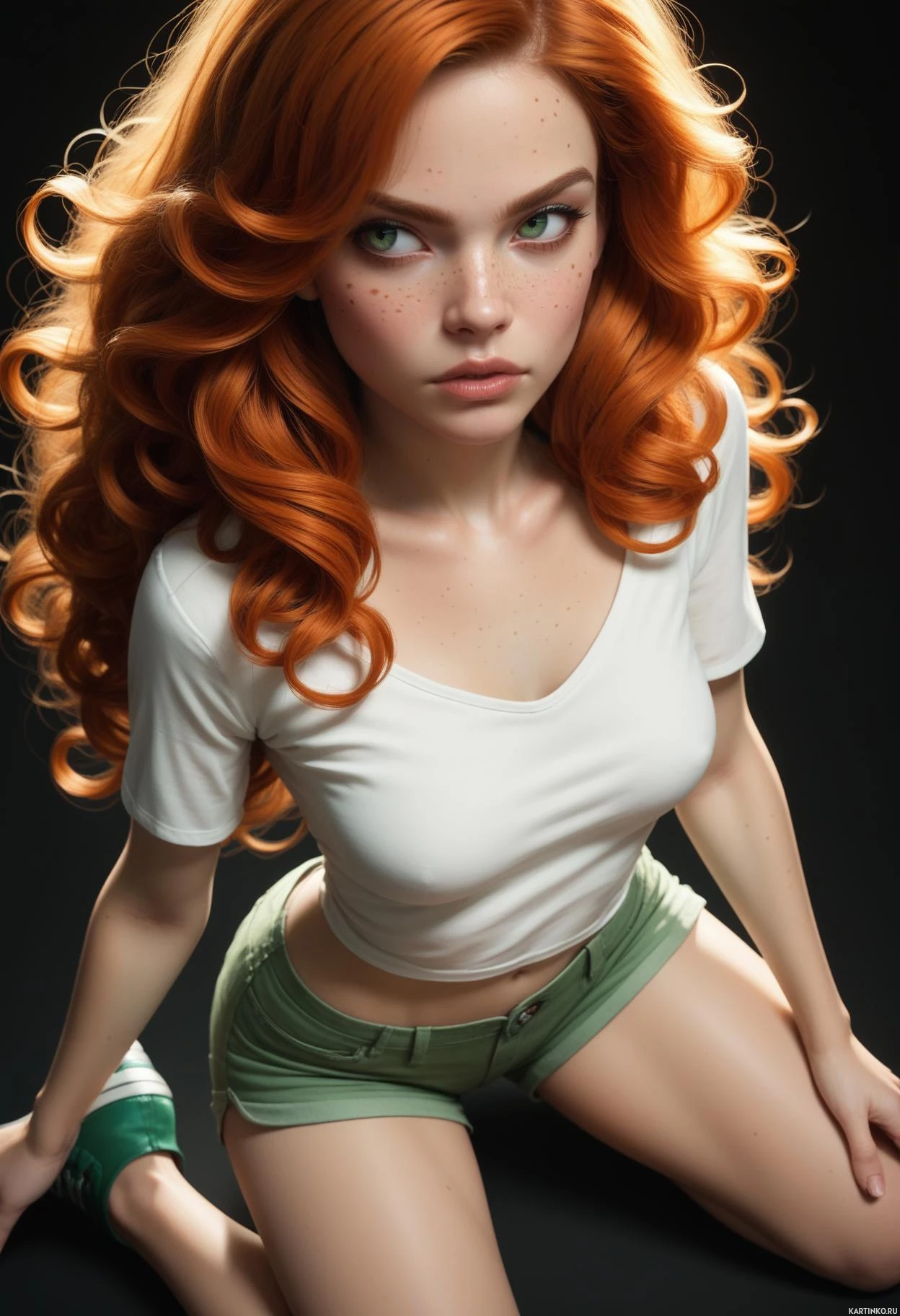 red hair, styled in a way that it falls elegantly around her shoulders. She is dressed casually in a white t-shirt and green pants. Her pose is relaxed yet confident as she sits with one leg extended outward. Her gaze is directed off to the side, and her