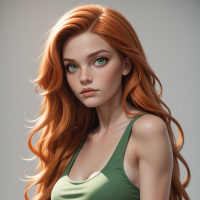 The image shows a young woman with long, wavy red hair. Her expression appears to be neutral to slightly contemplative. She has fair skin and is wearing a sleeveless top in a shade of olive green. The background is plain and light-colored, which suggests it might be a studio setting intended for portrait photography.