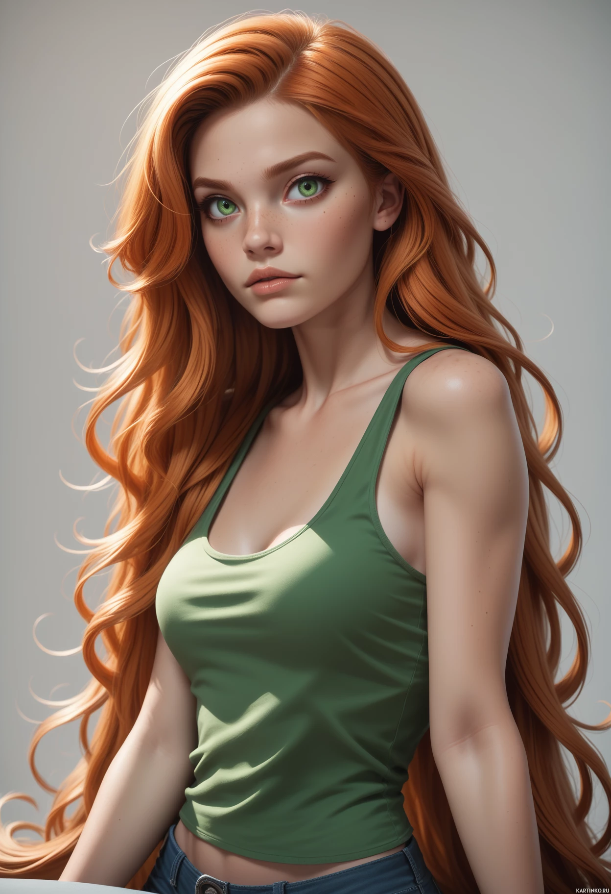 На картинке запечатлена молодая женщина с длинными волнистыми рыжими волосами. Выражение её лица нейтральное, немного задумчивое. У неё светлая кожа, она одета в летний топ оливкового цвета. Фон однотонный, светлый, что говорит о том, что это, возможно, фотостудия, предназначенная для портретной съемки.