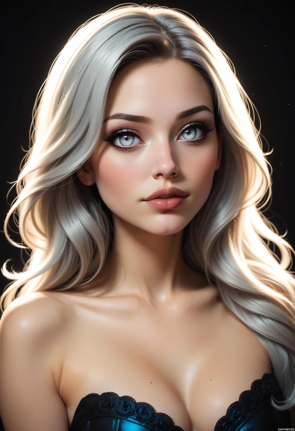 На картинке изображена женщина с белоснежными волосами, уложенными мягкими волнами. У нее светлая кожа, а взгляд добрый и направлен немного влево от камеры. Макияж выполнен деликатно, с естественным оттенком губ, который гармонирует с ее тоном кожи. На ней наряд, похоже, из кожи или материала, похожего на кожу, в темном оттенке. Одежда имеет тонкие бретельки и вырез на шее, что добавляет образу дерзости и элегантности. В целом, ее выражение лица спокойное и уверенное.