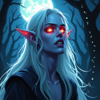 The image features a fantasy theme with a female character at its center. She has white hair and pointed ears, which are typical characteristics associated with the fantasy race known as drows in some fictional universes. The character is wearing a black garment that could be interpreted as armor or a jacket, given its design. Her expression is serious, and she gazes off to the side rather than directly at the viewer. The background depicts a nocturnal scene under a full moon, with silhouettes of trees on either side framing the character. The overall color palette is dominated by shades of blue and black, contributing to an eerie and mysterious atmosphere that might be associated with fantasy or horror genres. The image is detailed and well-composed, with a focus on the contrast between the illuminated moon and the darker surroundings.