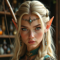 blonde hair styled in braids and is wearing pointed ears that are typical for such characters. They have striking