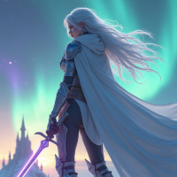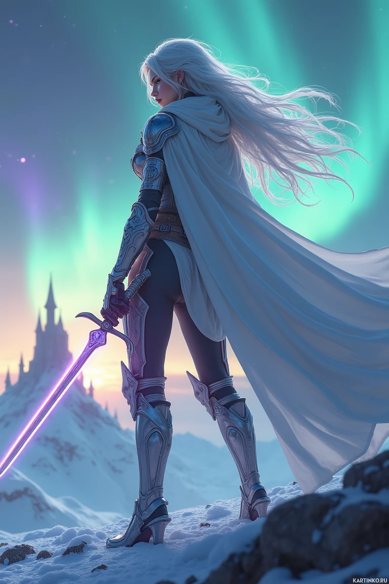 На картинке изображена женщина с длинными белыми волосами. Она стоит на вершине заснеженного пейзажа, вглядываясь вдаль. На ней доспехи, в руке меч. На плечах накинут плащ, подчеркивающий её воительственный вид. На заднем плане видны горы и замок, силуэт которых выделяется на фоне неба в лучах, кажется, восходящего или заходящего солнца.