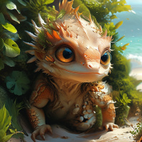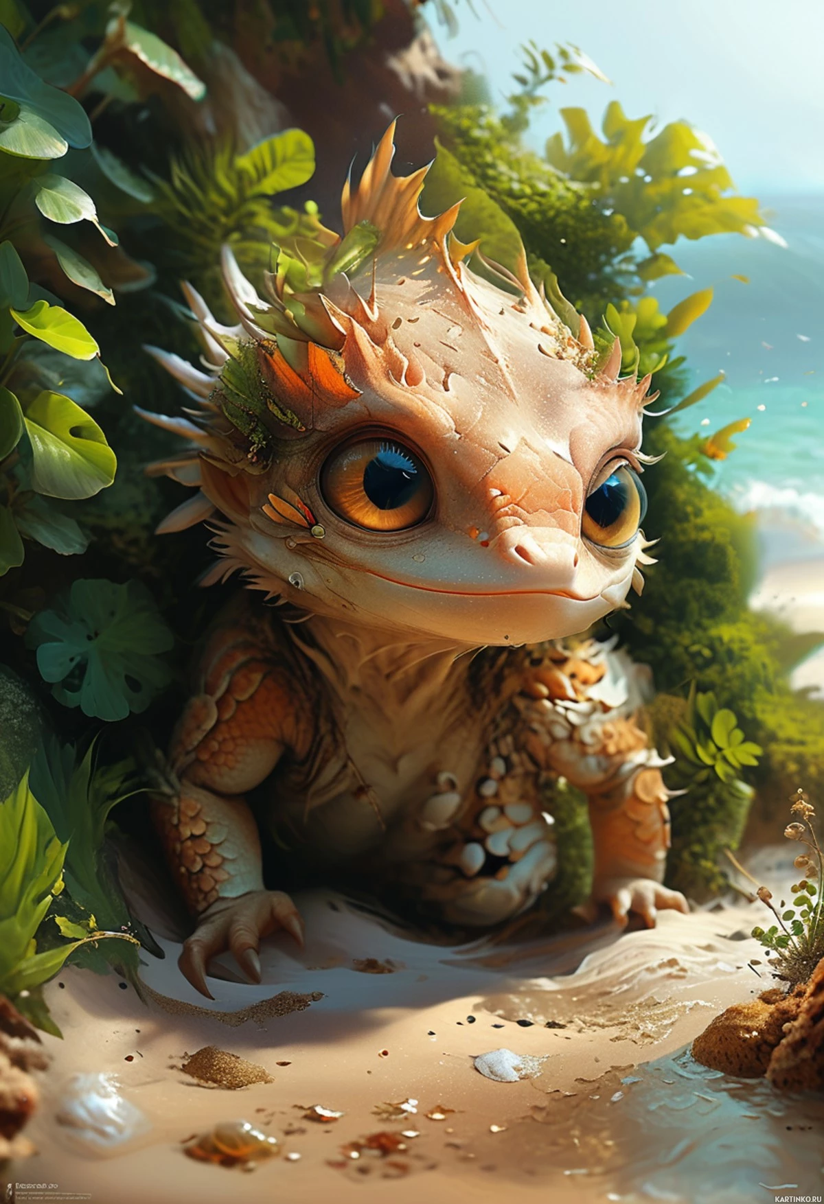an outdoor setting that could be near a beach or riverbank due to the presence of water and greenery. There are plants with heart-shaped leaves around the creature, adding