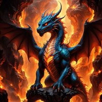 The image depicts a fantasy-themed artwork featuring a dragon at its center. The dragon appears majestic, with detailed scales and wings, and is perched on a rock amidst a backdrop of lava and smoke, which suggests a volcanic or magma-filled environment. The dragon's gaze is directed towards the viewer, creating an intimate connection despite its imposing presence. The surrounding elements include flames and what appears to be molten rock, enhancing the sense of a fiery landscape. The artwork is rich in detail and vivid in color, contributing to its dramatic and epic feel.