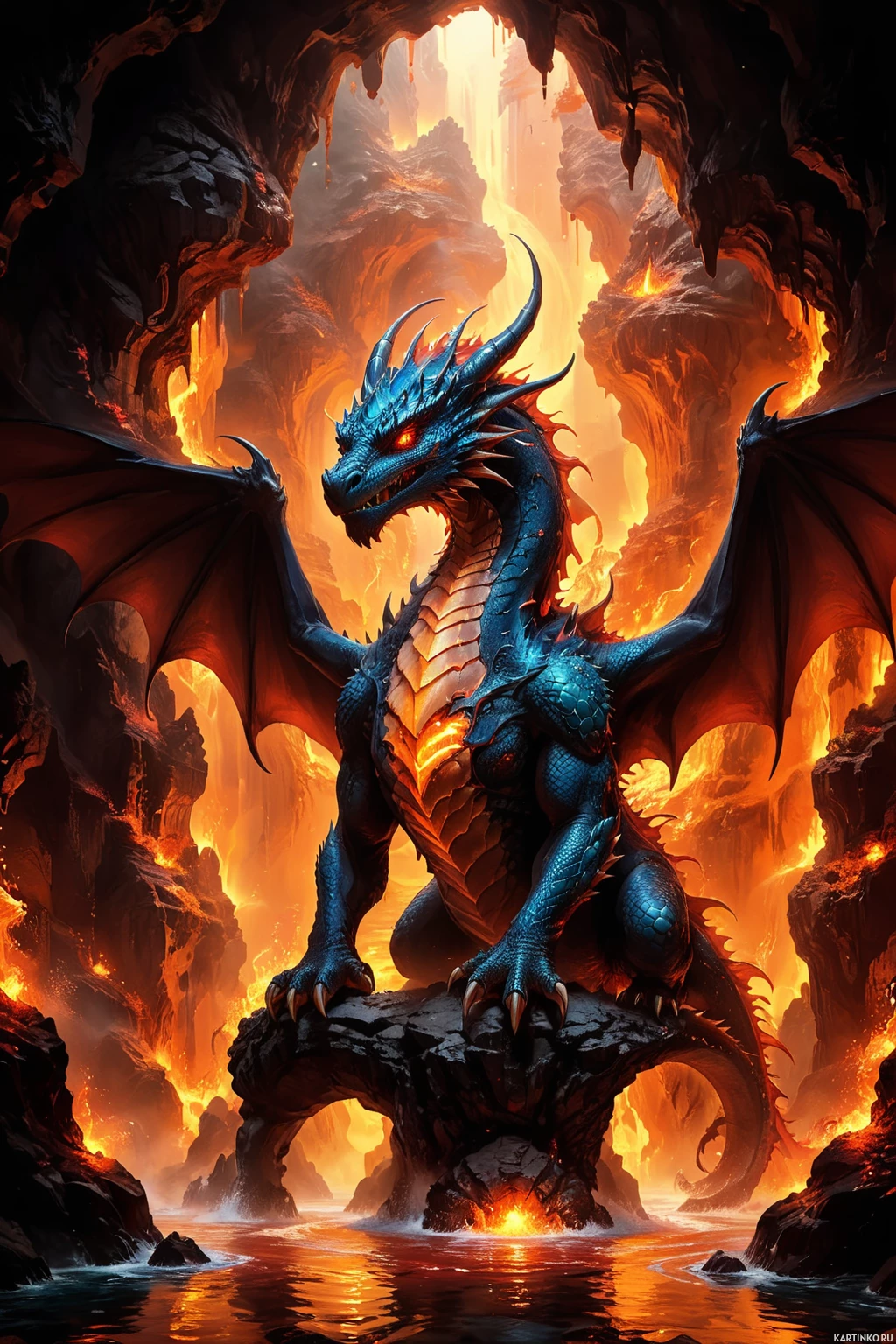 На картинке изображено фэнтезийное произведение, в центре которого – дракон. Он выглядит величественным, с детально проработанными чешуйками и крыльями, и восседает на скале на фоне лавы и дыма, что указывает на вулканическую или магматическую среду. Взгляд дракона направлен на зрителя, создавая ощущение близости, несмотря на его внушительный вид. Вокруг бушуют языки пламени и, кажется, раскалённая порода, усиливая ощущение огненного пейзажа. Картинка богата деталями и отличается яркой цветовой гаммой, что придает ей драматичный и эпический характер.