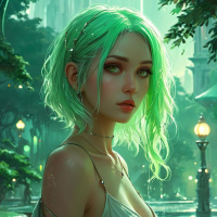 На картинке запечатлена молодая женщина с зелёными волосами и светлой кожей. Она немного опустила глаза, создавая ощущение задумчивости или смущения. Её губы слегка приоткрыты, словно она собиралась что-то сказать, но задумалась. На ней топ с открытым плечом из серебристой ткани с лямками и пряжками на плечах и торсе, что отсылает к стилю, напоминающему фэнтези или готику. Фон похож на средневековую или фэнтезийную городскую улицу с булыжной мостовой, фонарями и арочными проёмами. Архитектура богато украшена и детализирована, что говорит о её принадлежности к игровому миру.