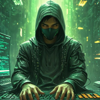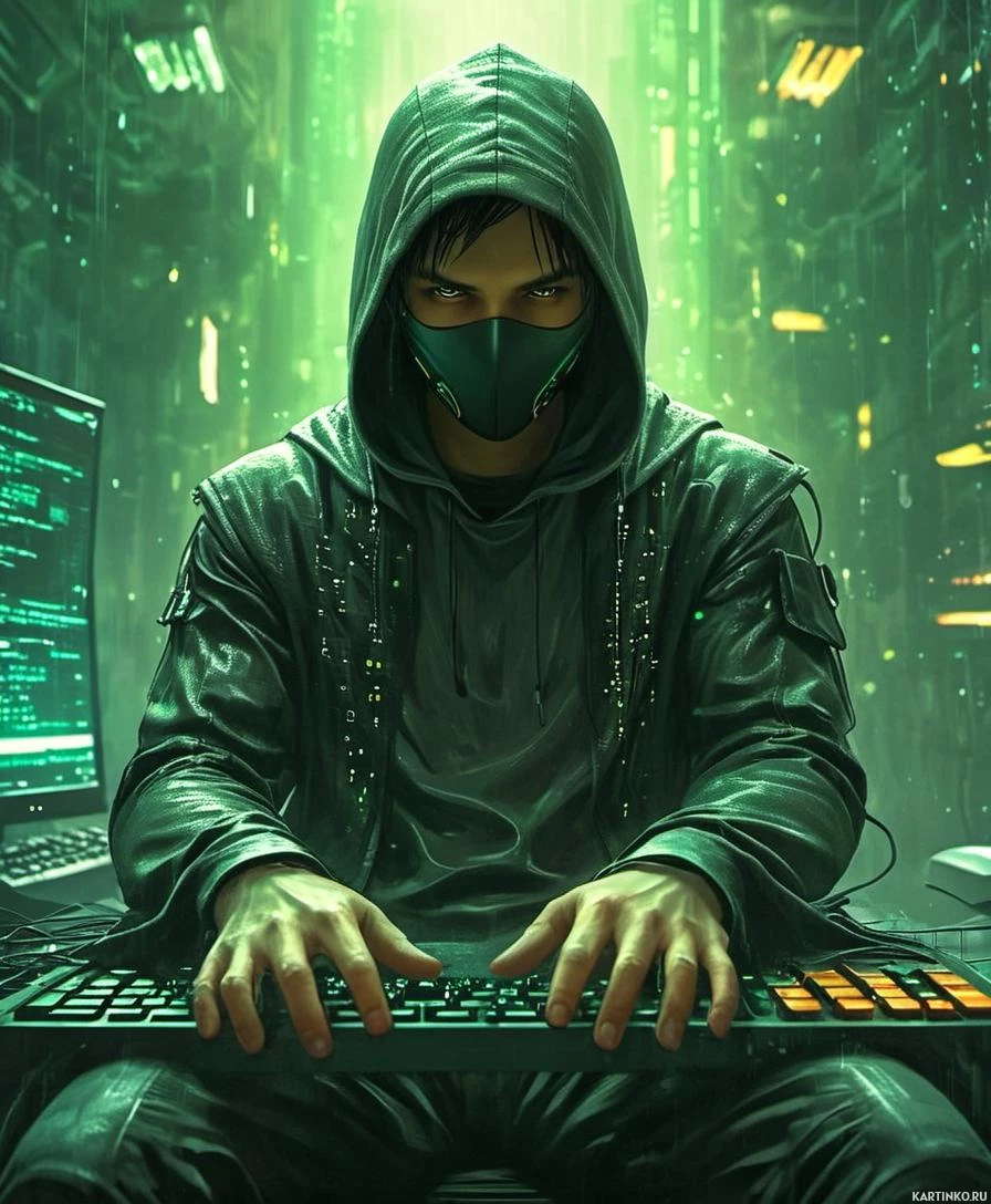 На картинке мужчина сидит перед компьютерным монитором и клавиатурой. На нём чёрный худи и маска, скрывающая лицо, видны только глаза. Его руки лежат на столе перед ним, готовые коснуться клавиш клавиатуры. На заднем плане – индустриальная обстановка с металлическими трубами и проводами, создающая ощущение высокотехнологичной среды.